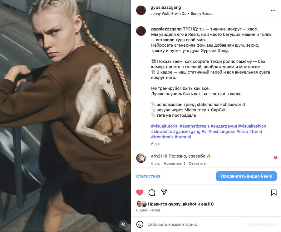 — Обучающее видео по тренду, созданное в CapCut с использованием изображений из ChatGPT и анимацией в Higgsfield, было реализовано под Нельзяграм Reels.