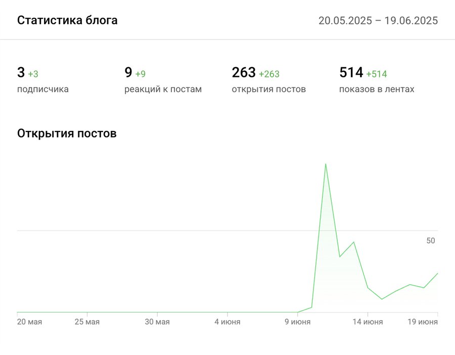 Общий охват составил 514 показов, из них 263 — открытия карточек. Просмотры распределялись равномерно в течение нескольких дней, с пиком в день публикации. Это подтверждает, что VC лучше считывает структурированный практичный контент — такую подачу мы изначально и тестировали на этой платформе.