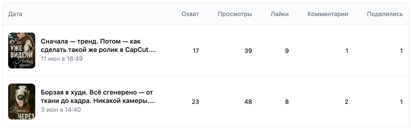 ⟶ У нас CapCut-гайд и борзая собрали по 8–9 лайков, но просмотров — 87 в сумме. Качество вовлечения высокое, но формат недостаточно встроен в внутренние тренды VK Клип.