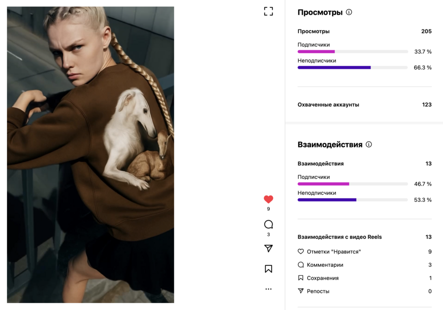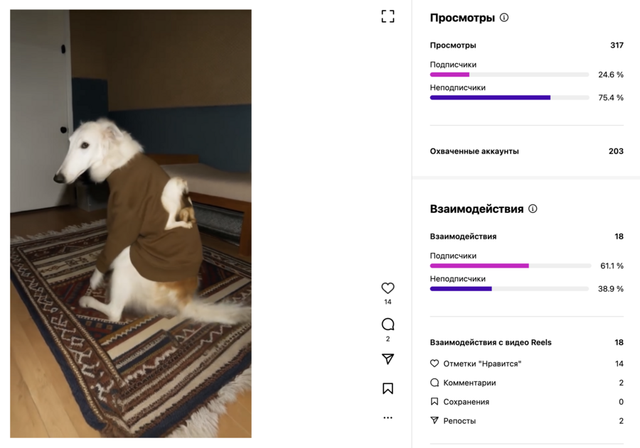 В Reels было опубликовано два видео: ролик с борзой и ягнёнком (317 просмотров, 18 взаимодействий) и визуальный тренд с каруселью (205 просмотров, 13 взаимодействий). Первый сработал лучше на своих — 61% вовлечений от подписчиков. Второй привлёк холодную аудиторию — 66% просмотров от неподписчиков. Оба ролика собирали отклик через ленту Reels, а вовлечённость обеспечивали визуальные ходы, темп и узнаваемый монтаж.