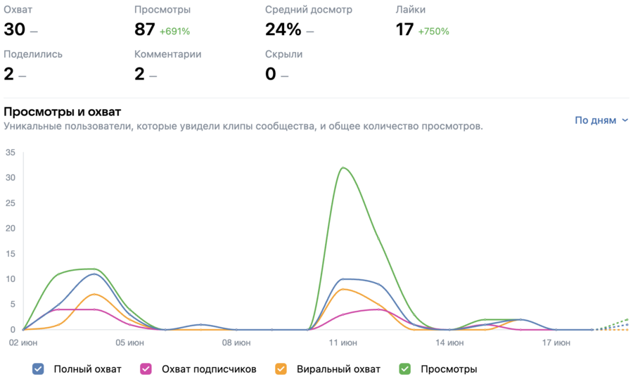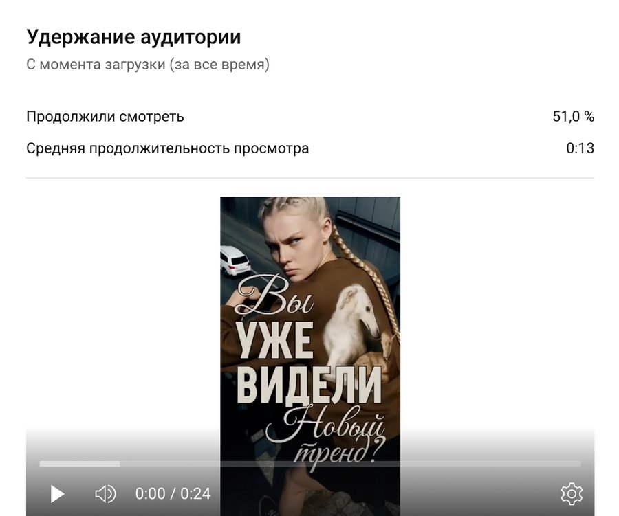 В VK Клипах динамика была схожей: CapCut-гайд получил 9 лайков, комментарий и репост, дроп с борзой — 8 лайков и комментарий. При этом общее количество просмотров выросло до 87, средний досмотр составил 24%. Охваты были преимущественно виральными и проявлялись спустя 2–3 дня после публикации. Это подтверждает гипотезу проекта: даже визуально идентичный контент даёт разные результаты в зависимости от формата подачи и алгоритмов платформы.