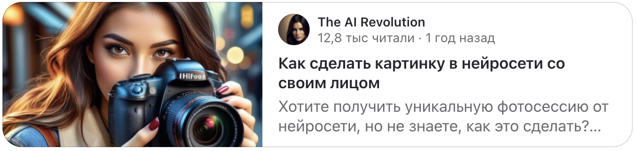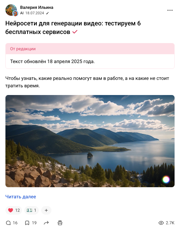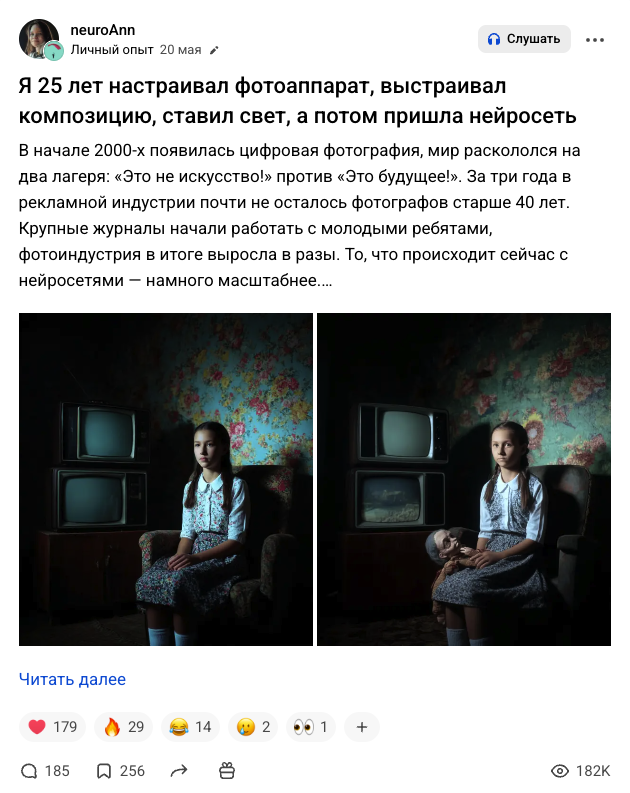 Кейс: статья «Нейросети для генерации видео: тест 6 бесплатных сервисов» собрала 2,7 тыс. просмотров и 16 комментариев. Причина — чёткая структура, примеры промтов, советы эксперта и наглядные сравнения. Ещё один успешный материал — личная история фотографа, который перешёл от плёнки к нейросетям: 182 тыс. просмотров, 185 комментариев. В обоих случаях сработал эффект «нарратив + гайд», где читатель получает эмоцию и пользу одновременно.