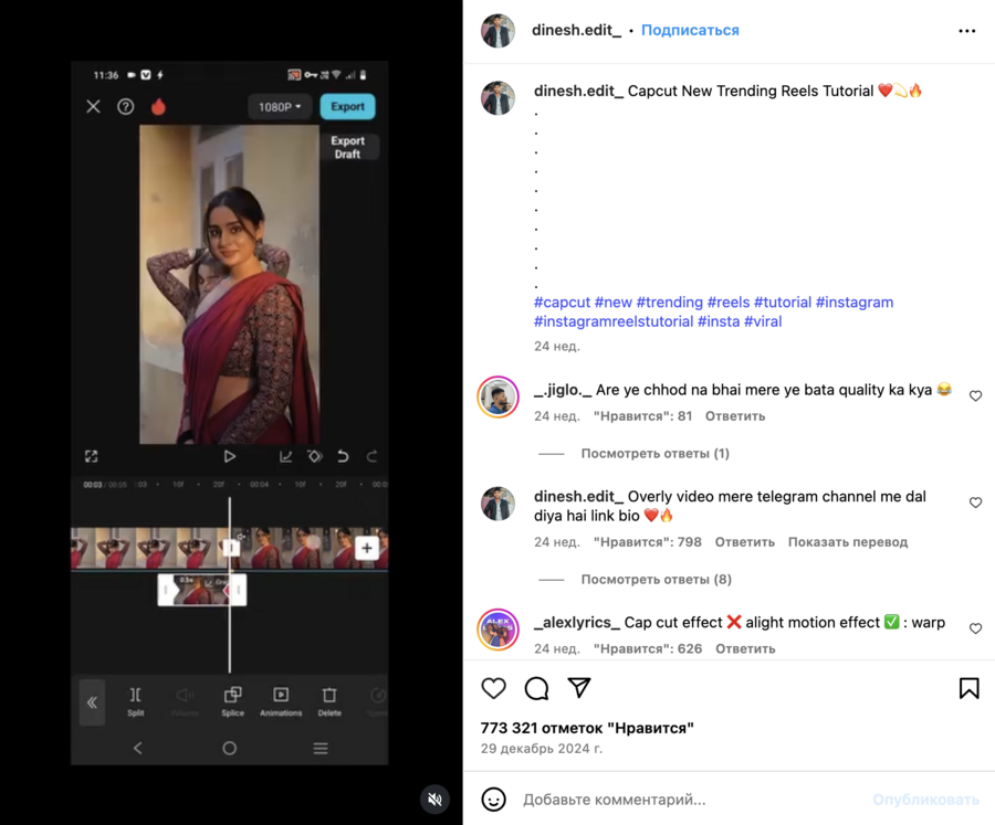 Reels — CapCut-гайды и стилизованные фишки Кейс: @dinesh.edit_ с туториалом «CapCut Trending Edit» — 773 тыс. лайков. Видеоряд — до/после + чёткая инструкция.