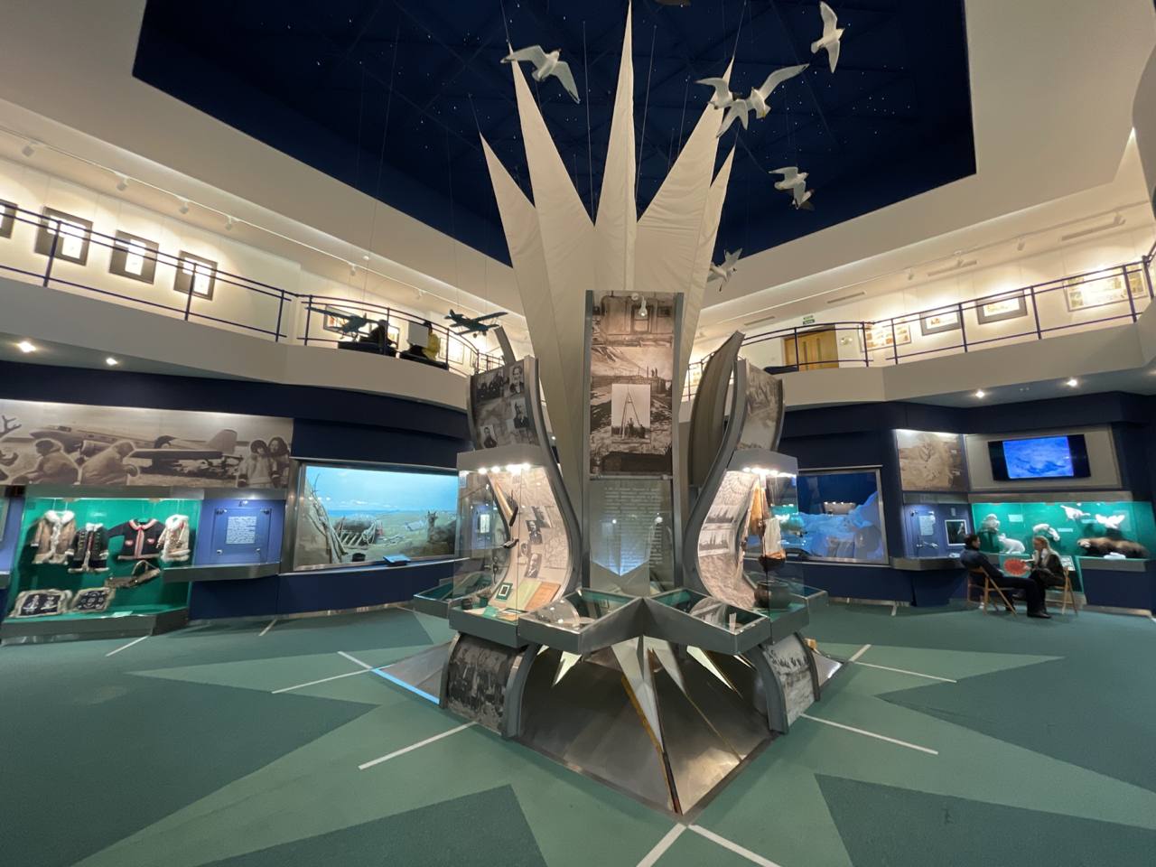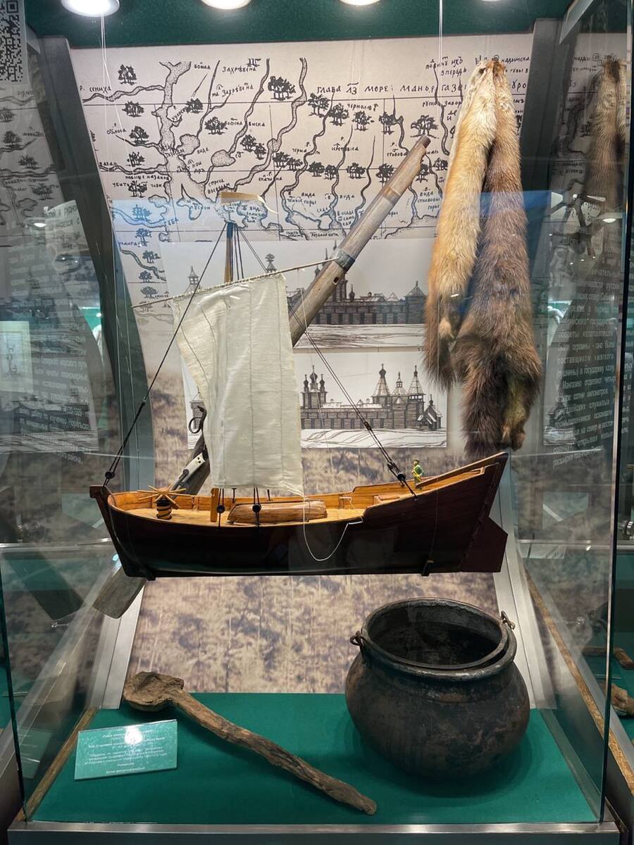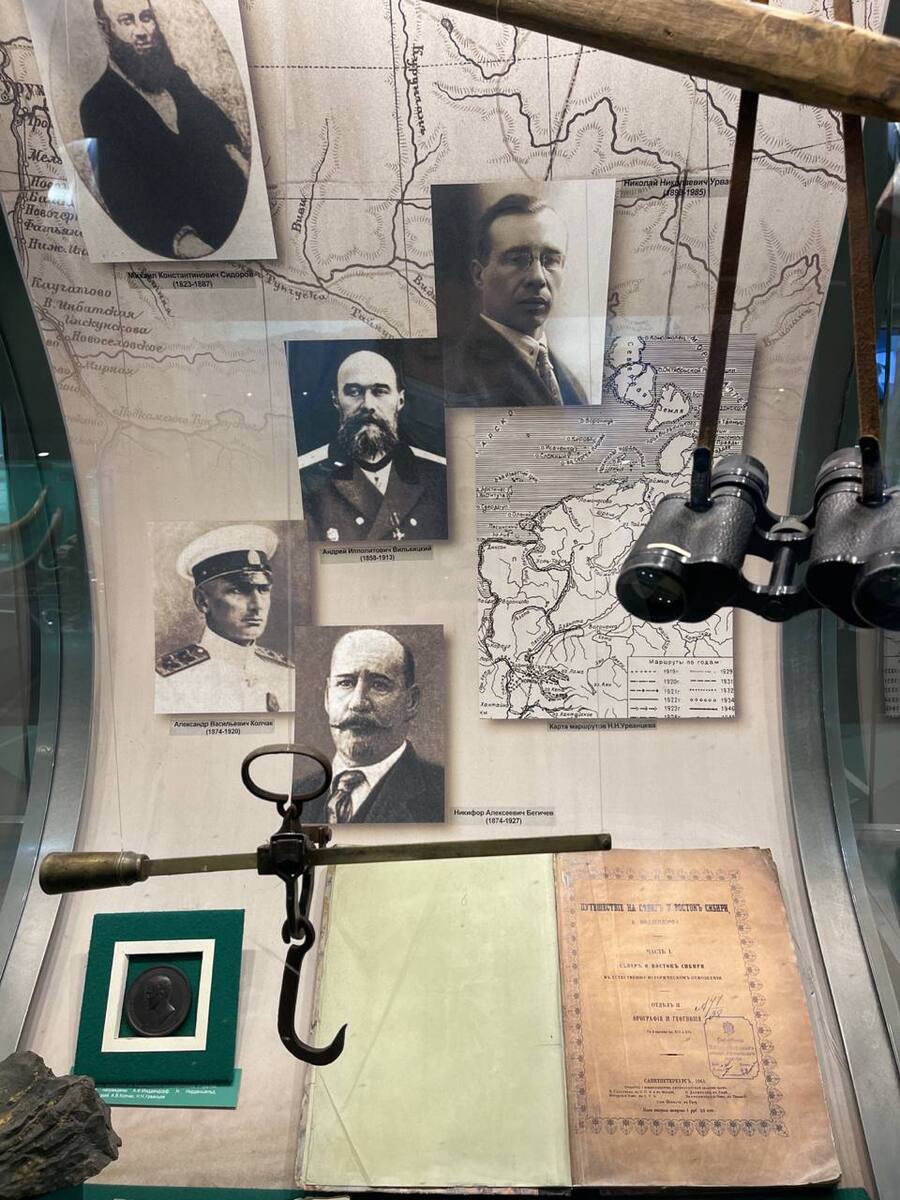 On the first floor, we can see an exhibition that consists of three thematically different but closely intertwined sections in the sense that they present a complex narrative about the prehistory of Norilsk, namely a period when this settlement has not yet existed. Along the perimeter of the floor, there are two sections about the nature of the Taimyr region, and about indigenous people. Here we can see photographs, stuffed animals, traditional dressings, yurts, tools, and household items. This exhibition surrounds the central showcase with historical milestones of the osvoenie of the region — the foundation of Mangazeya; various expeditions of the 16–19th century, presented as a heroic conquest of the north by Russians and the expansion of Russia; and finally, Soviet scientific expeditions. There we can see photos of people who participated in expeditions and exploration, measurement instruments, models of ships, compasses, letters, books, and maps.
