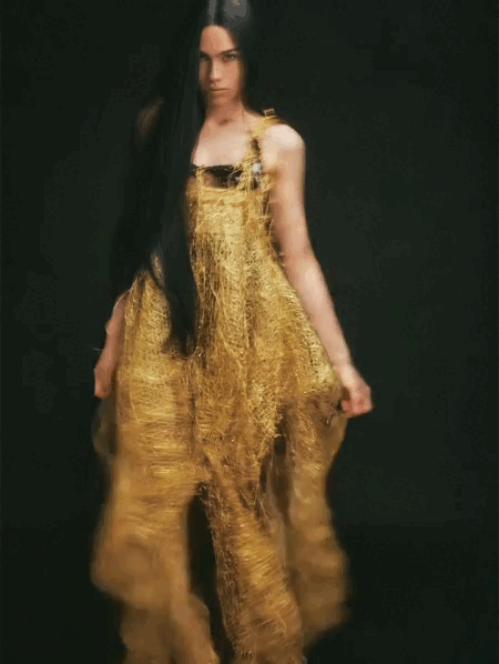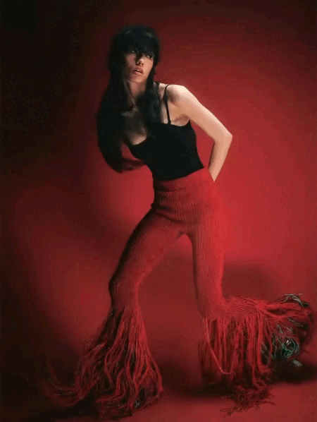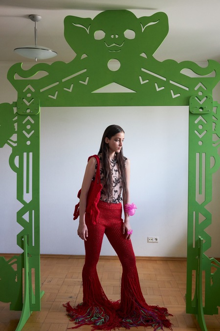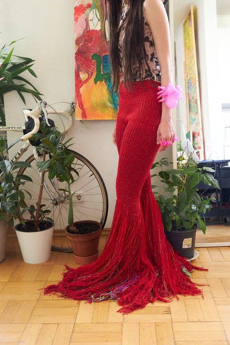 «Брюки „Пылающая река“: ярко-красные брюки ручной вязки с длинной бахромой и блестящей нитью. Облегают бёдра и эффектно расширяются к низу, создавая ощущение движения и огня».