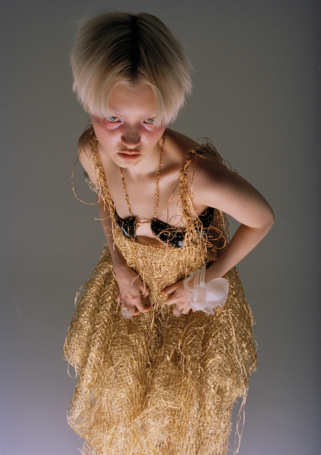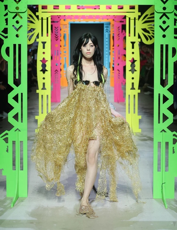 «Золотое платье Vereja — единственный экземпляр, второго такого не будет. На груди — вязаные патчи с Веномом, его силуэт повторяется и в декоративной детали на спине».