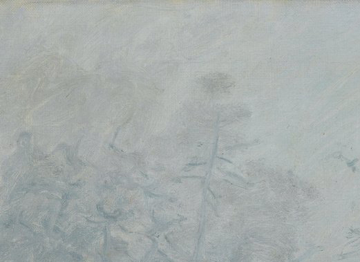 Пленэрный метод в данном случае принципиален. Сислей писал на месте, в прямом контакте с влажным воздухом, переменчивой световой ситуацией и низкой видимостью. Пленэр не только позволял ему наблюдать оттенки тумана в реальном времени, но и требовал работать быстро и точно, без излишнего моделирования. В таких условиях каждый мазок становится реакцией на момент: художник фиксирует состояние природы в ту самую минуту, когда оно ещё нестабильно. Именно пленэрная практика делает изображённый туман правдоподобным: он живёт, дышит и медленно растворяет пространство. Материалы, которыми пользовался Сислей, соответствуют технике пленэра середины XIX века. Он писал маслом на холсте, но использовал краски с высокой степенью разбавления, что позволяло сохранять лёгкость и воздушность. Художник активно применял свинцовые белила, жёлтые и красные охры, умбру, светлые зелёные тона на основе хрома. Белила играют ключевую роль: именно они формируют туманную вуаль, смешиваясь с охрами и голубыми оттенками и создавая сложную систему тончайших переходов. Эта смесь даёт эффект подсвеченной дымки, через которую ломаются очертания.