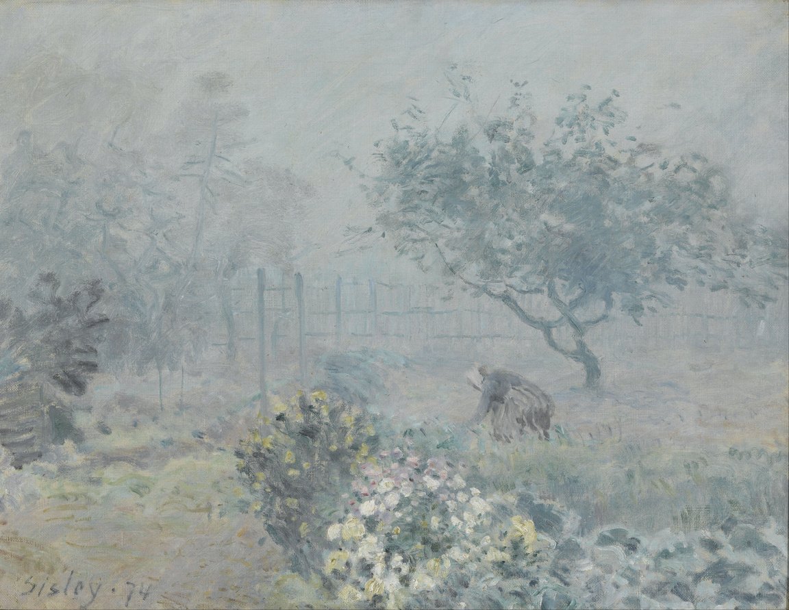 На композиционном уровне туман функционирует как центрообразующий элемент, вокруг которого структурируются остальные компоненты: растительность, дерево, изгородь, земля и фигура женщины. Пространство построено по принципу постепенного растворения форм: передний план с цветами и кустарником представлен относительно чётко, средний план — дерево и ограда — теряет контурную ясность, а дальний план практически растворяется в светлой туманной массе. Подобная модель зрительного пространства связана с исследовательской стратегией, характерной для Сислея середины 1870-х годов, когда художник систематически обращается к мотивам переходных атмосферных состояний. Работа над полотном вписывается в фазу интенсивного пленэрного эксперимента, в ходе которого Сислей стремится зарегистрировать не столько конкретное место, сколько физические параметры среды. Пленэр для него перестаёт быть техникой работы на открытом воздухе в узком смысле; он превращается в метод полевых наблюдений, направленный на выявление закономерностей зрительного восприятия при изменяющихся условиях освещённости.