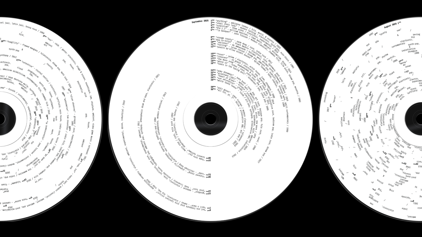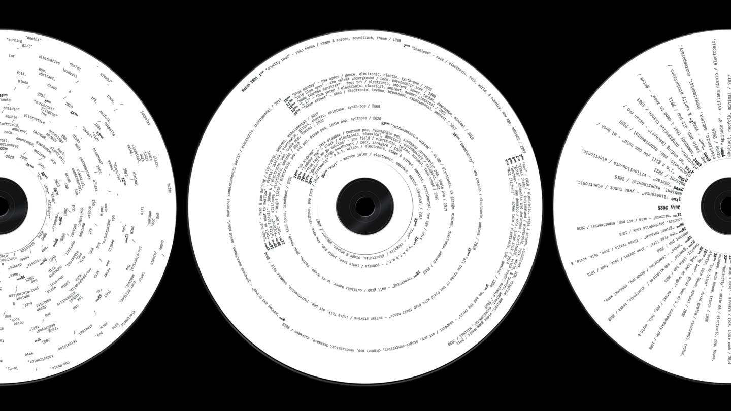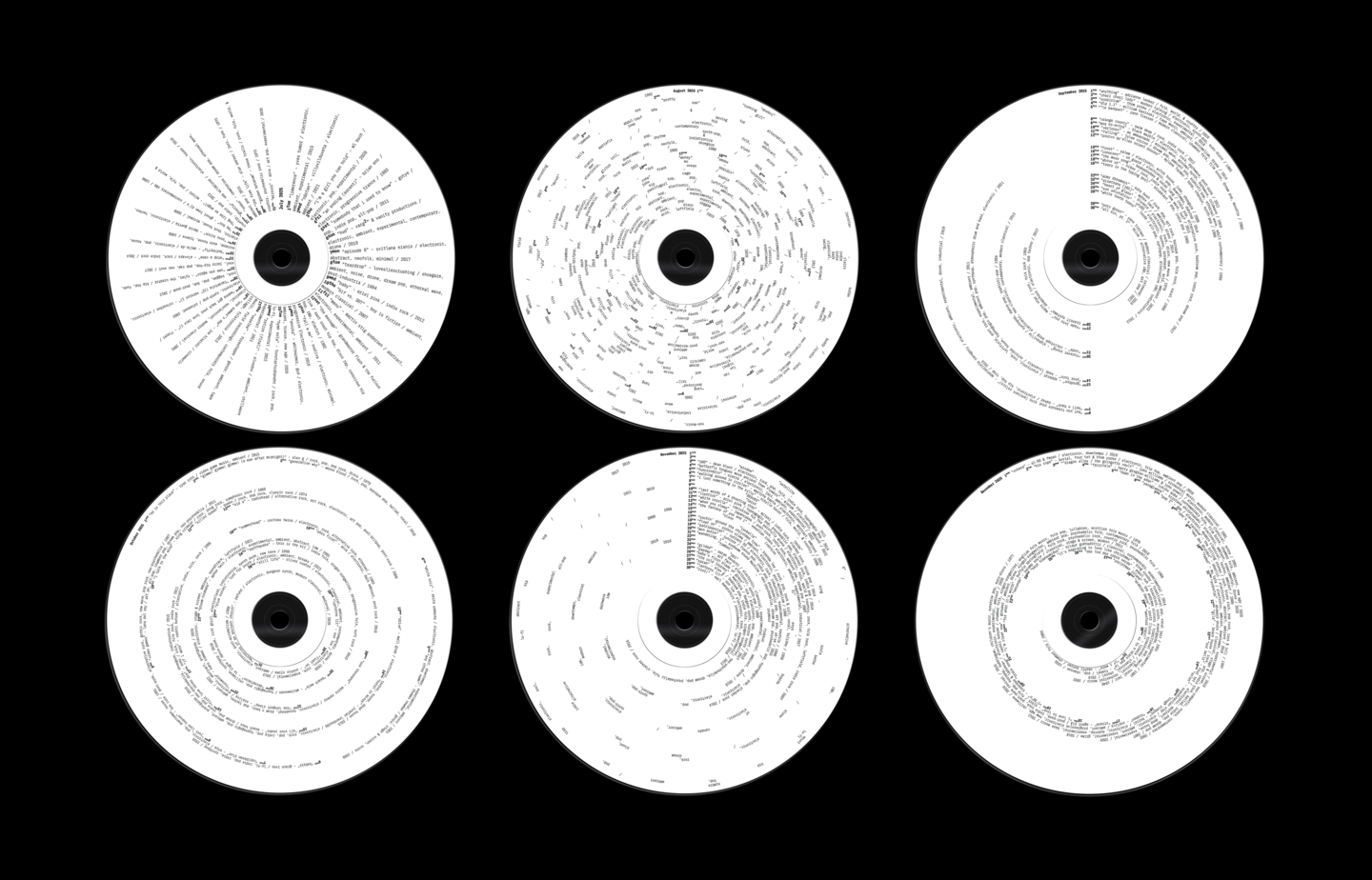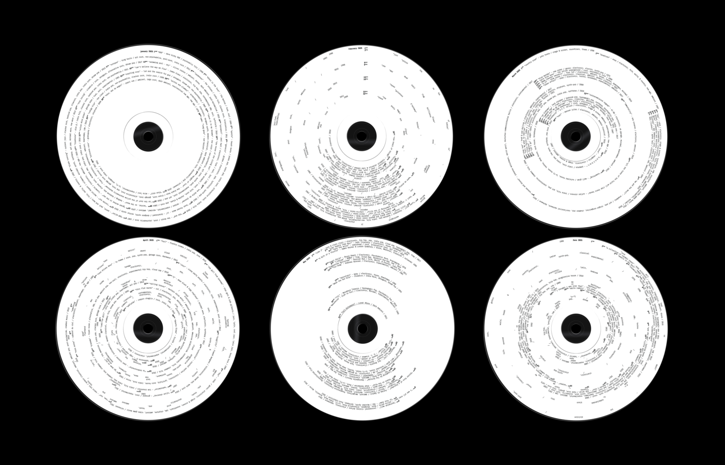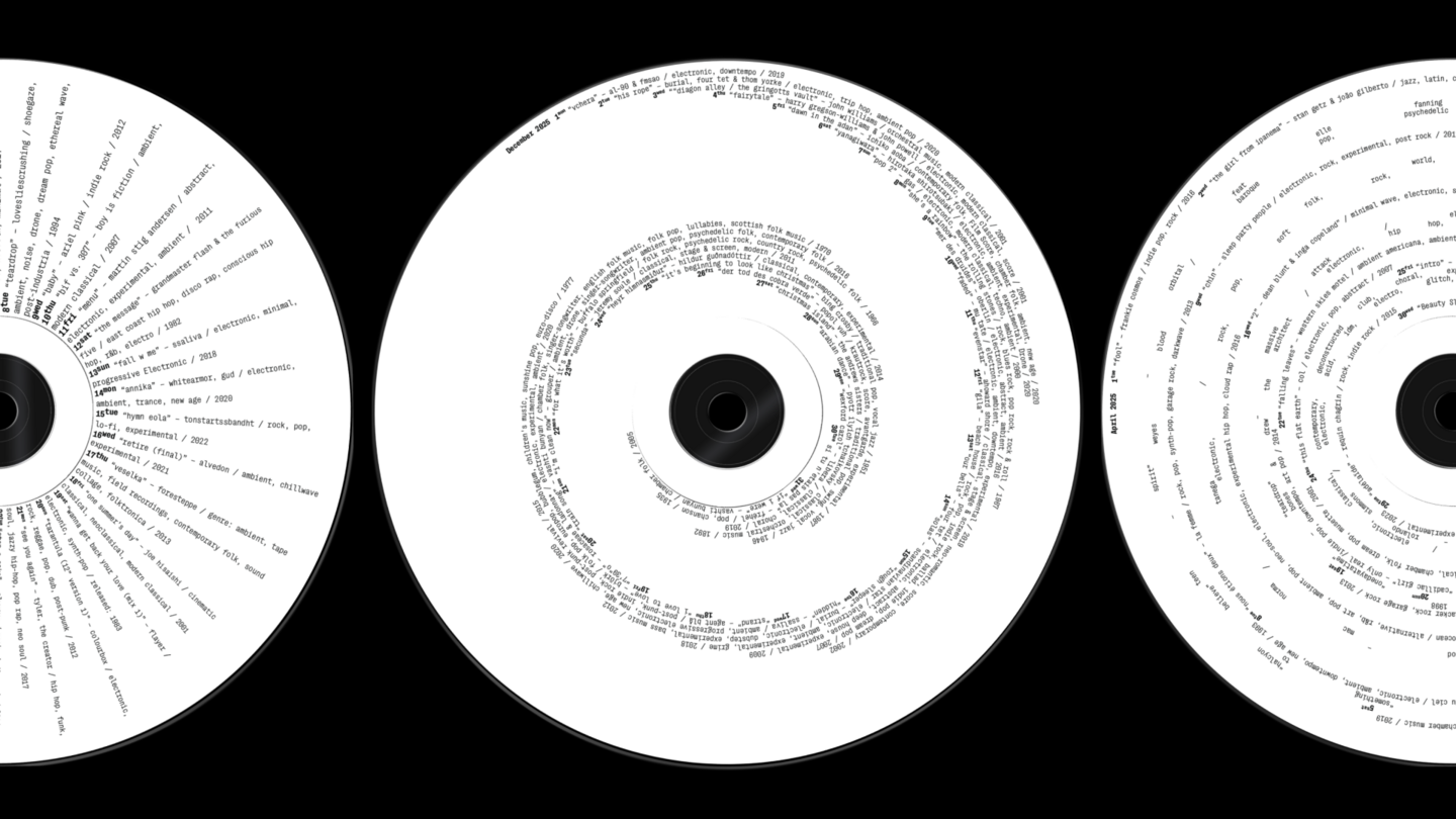 A Year in Sound — это экспериментальный календарь, представляющий год через музыку. Каждый из 12 дисков отражает музыкальный ландшафт месяца, визуализируя даты релизов, исполнителей, жанры и названия песен в виде круговых типографических композиций. Проект превращает статистику стримингов в визуальный ритм, где текст становится носителем данных и формирует собственное звучание.