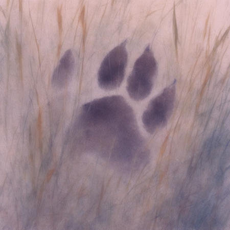 SD: a painting in TYRUS-WONG-ZVER style, close-up of a single wolf paw print | a dark wolf-shaped shadow barely visible among mist and grass