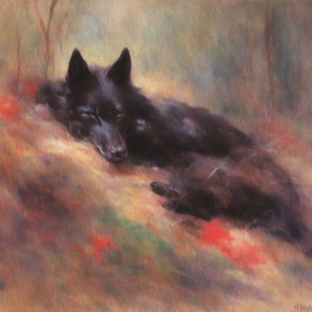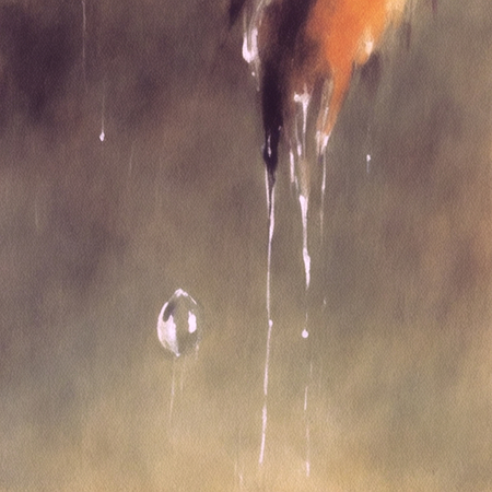 SD: a painting in TYRUS-WONG-ZVER style, close-up view of a single droplet of water falling from the black ink wolf’s whisker into a still puddle | sleeping black wolf