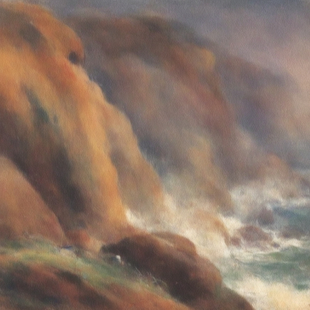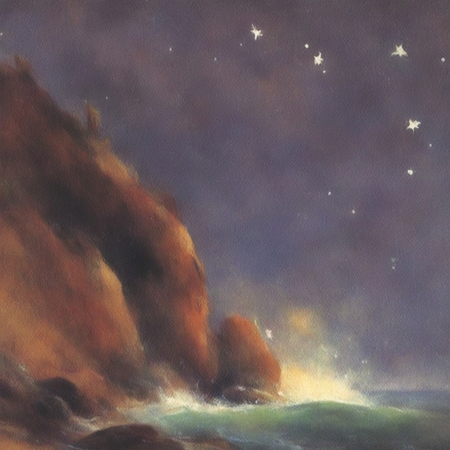 SD: a painting in TYRUS-WONG-ZVER style, a coastal cliff overlooking a choppy sea, with mist at night, twilight sky with stars