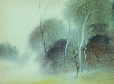 SD: a painting in TYRUS-WONG-ZVER style, a lone deer standing still in a misty nighttime field, its antlers faintly catching starlight, body blurred into the fog