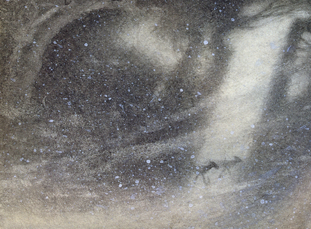 Где-то вдалеке — фигура оленя, растворяющаяся в дымке. Всё это написано мягкой кистью, в ночных серо-синих оттенках.