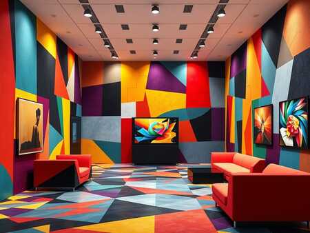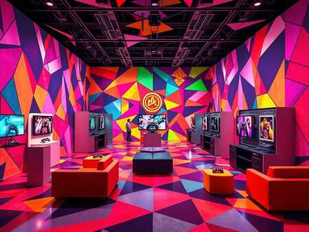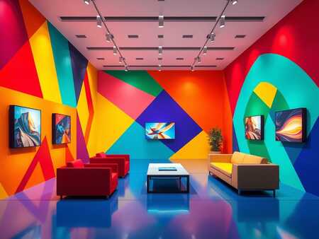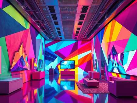 Photorealistic image of a brightly decorated, existing digital art exhibition space. The space should be modern and minimalist, utilizing abstract geometric patterns in vibrant, saturated colors as the primary design element. These patterns should be incorporated into the walls, flooring, and potentially even the furniture. Think bold, contrasting color combinations and dynamic shapes. The overall lighting should be bright and even, highlighting the vibrancy of the colors and the clean lines of the geometric patterns. The space should appear spacious and welcoming, creating an atmosphere conducive to viewing and appreciating digital art. Include details like subtly lit display cases or screens showcasing digital artwork, and seating areas that complement the overall design. Avoid cluttered or chaotic arrangements; maintain a sense of order and sophistication. The image should appear as a photograph of a real, fully realized exhibition space, not a simple rendering.