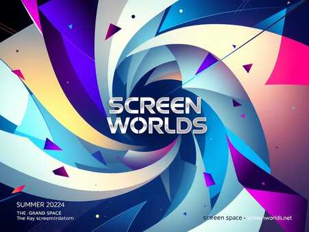 Create a modern, sophisticated poster for a video game exhibition showcasing unconventional controllers and player interaction called «Screen Worlds». Use abstract shapes, dynamic lines. Highlight interaction visuals, a semantic center or dynamic composition. Highlight the name of the exhibition, carelessly include the date, venue and website. Avoid retro hacker aesthetics or images of game controllers. The poster should be clean, attractive, and pique curiosity. No in-game screenshots.