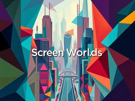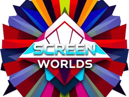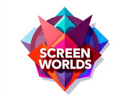 Create a minimalistic logo for a game exhibition showing unconventional controllers and player interaction called «Screen Worlds». Avoid retro hacker aesthetics or images of game controllers. The logo should use a bright and contrasting color palette, sharp and sharp geometric patterns consisting of sharp angles and color-filled planes. The logo should scale easily without losing its visual appeal and readability. It should retain its elegance and simplicity when reduced in size for web use or enlarged for print publications. The logo should be centered on a pure white background. The resulting image should be a vector image for optimal scaling and adaptation to different sizes and formats. The logo should convey in its design a creative energy, a desire to experiment. Avoid overly decorative elements.