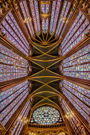 Часовня Сент-Шапель была истинным архитектурным шедевром своего времени. На фото видно, что опорные колонны подобно лучам устремляются в высь и органично переходят в потолочные нервюры. В постройке было впервые применено сплошное остекление, стены буквально составлены из стекольных витражных конструкций.