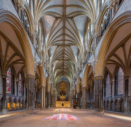 Готические соборы в Англии часто высятся на открытых участках, и этим отличаются от французских, причем отношение ширины к длине во французских остается 1:4, а в английских оно доходит до 1:6. Аспида прямоугольная, полуциркулярная с венцом капелл встречается редко. В период ранней готики в интерьере преобладает горизонтальное членение. Самостоятельными части целого становится хор, неф и трансепт (Маца и Брайцева, 1966). Соборы в Англии имели специфическое, усложненное планирование, поперечных нефов два, над средокрестием обычно возводилась башня, при этом башни на углах западного фасада отсутствовали. Окно «роза» заменялась проемами с вертикальными членениями или сплошными витражами [2].