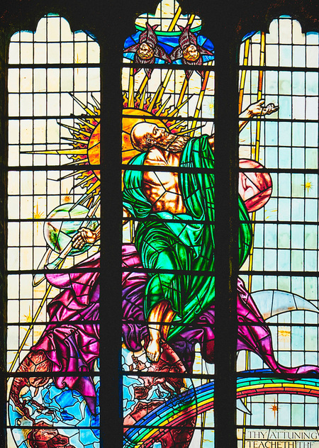 Обильный и разнообразный декор; большое прямоугольное витражное окно.
