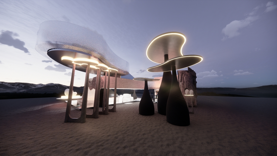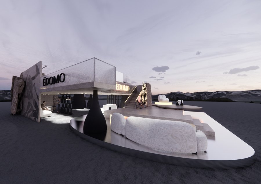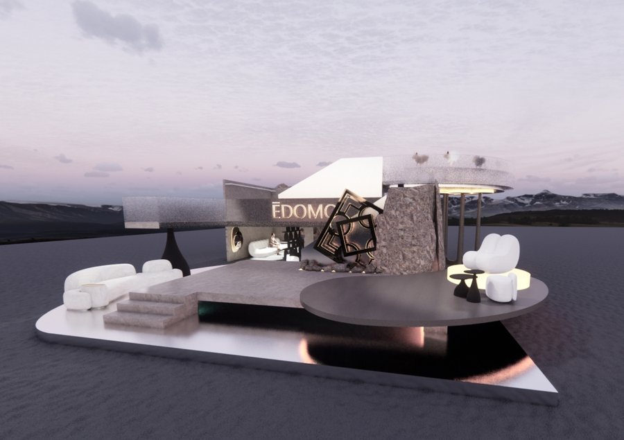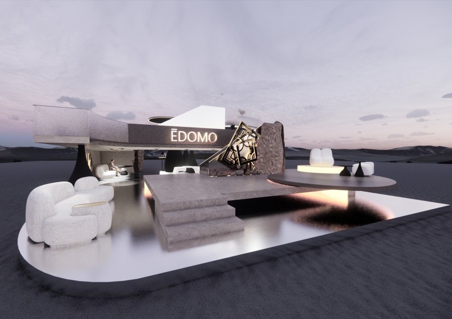 В основе стенда лежат множество платформ на разных уровнях, которые повторяют очертания предметов мебели бренда. На заднем плане стенда расположена композиция, состоящая из 3 воссозданных столов EDOMO (DOMES и BEANS) увеличенных в размере. В одном, из них интегрирована фотобудка для памятных фотографий в шапке папахе.