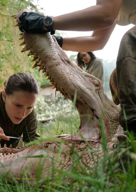 Одна из насыщенных сцен «Аннигиляции» — встреча отряда с аллигатором. При создании самого мутировавшего существа были задействованы и механические эффекты, и компьютерная анимация. Команда Тристана Верслуиса начала работу с создания глиняного макета, который нужен был для дальнейшей проработки общих пропорций и форм мутировавшего существа. На основе этого макета была изготовлена полноразмерная скульптура, позволившая установить реалистичную световую референцию и поверхностное взаимодействие, что значительно упростило работу на этапе цифрового композитинга. Для создания цифровой версии аллигатора использовалась 3D-сканированная модель, прошедшая этапы высокополигонального моделирования и текстурирования, чтобы добиться максимальной детализации, включая органические деформации и аномальные структуры зубов.