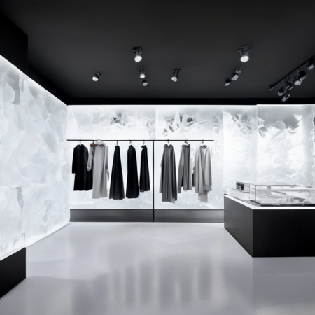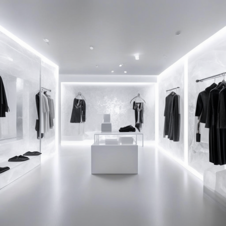 promt// Minimalist interior of the luxury clothing store of the brand «INEY». The main concept: the aesthetics of frozen heat. Visual style: hyper-realistic architectural photography, cold color palette. Central element: a large interactive «ice wall» on which crystalline frost patterns are formed, glowing with the brand logo. Materials: polished black granite countertops, walls of raw concrete, matte metal clothes hangers, frosted glass showcases. Lighting: subtle spot lighting of the products, cold ambient glow from the ice wall, and clear shadows. Color scheme: monochrome with shades of charcoal, ice blue, and matte black with occasional silver accents. Composition: a wide-angle view of the spacious, minimalist interior, with clothing sculpturally arranged on dark pedestals. All the clothing and accessories in the store are white with a small light blue frost growing on them.