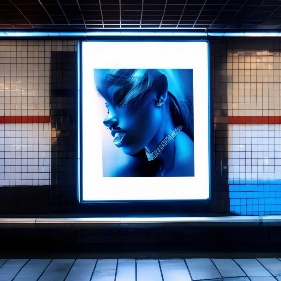 promt// Minimalistic fashion poster hanging in the subway station. Poster on which the word «INEY» is written and frost patterns of light blue color. Poster hanging on white brick glossy wall. Camera looking at the poster at a slight angle Negative prompt black color, people, warm light