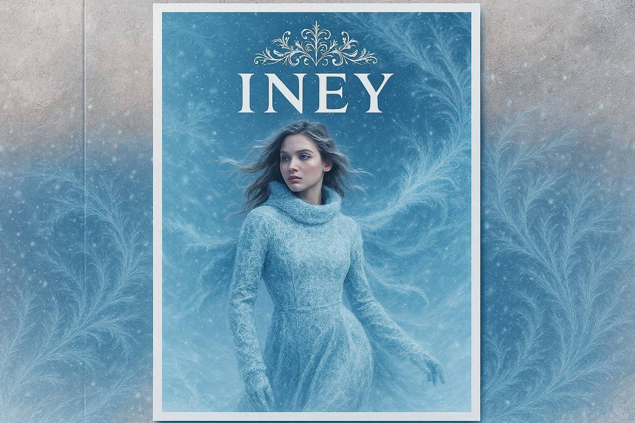 promt// Create a poster with an advertisement for the Iney clothing brand featuring a girl in fashionable icy crystal clothing, with the poster hanging on the wall of a building. Use blue color, movements, and frost patterns. Place the «INEY» logo on the poster, featuring elegant frost patterns in a white vector style. Use a clean, modern, transparent background. Use a realistic style.