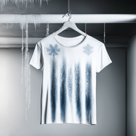 promt// A white t-shirt hangs on a hanger, which hangs on a hook that stretches from the ceiling with a frosty chain, on which a pattern of frost grows on a light gray background. Everything takes place in a room with light gray walls and studio lighting Negative prompt people, human, body parts, any clothing except t-shirts