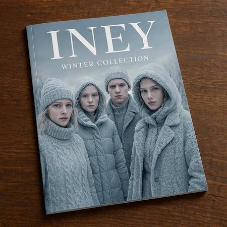 promt// Сreate a fashion magazine with a collection of clothes from a brand called «INEY», a winter collection, frozen models, and a realistic image on the table.