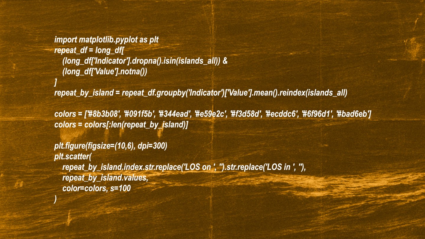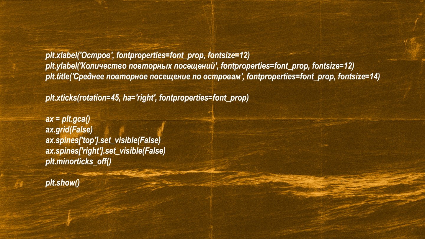 Интересно, что я не подчитывала изначальное количество островов в датасете, внеся изменения в количество цветов в избранной палитре уже после создания изначального графика. Я считаю, что «совместная работа с кодом» иллюстрируется этим примером как нельзя лучше — мне не пришлось проводить подсчеты в сложносочиненном датасете самостоятельно, я лишь внесла необходимые коррективы в визуальную составляющую.