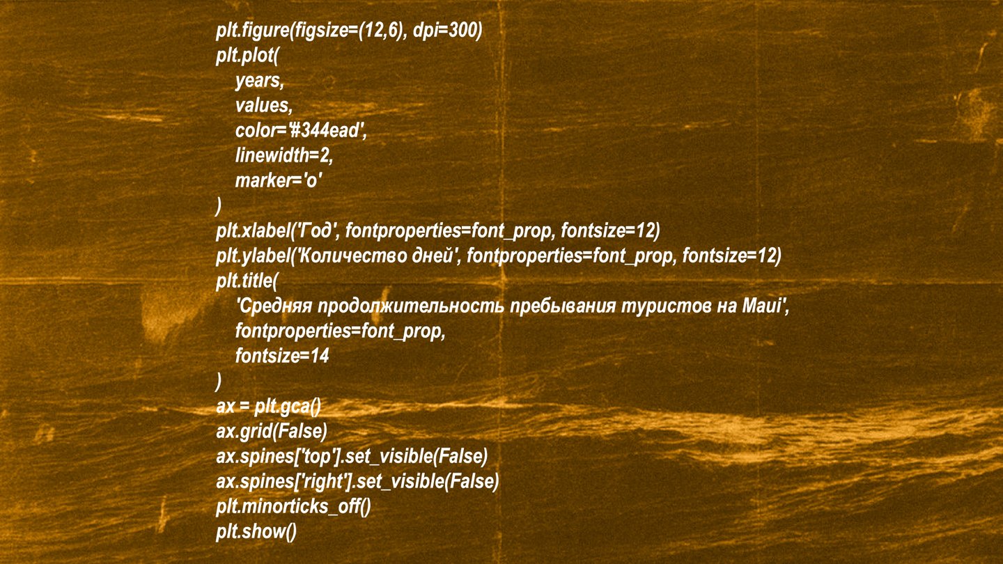 Анализ и визуализация данных из выбранного датасета позволили узнать, какие Гавайские острова существуют, насколько люди задерживаются на них, какие места являются самыми интересными в путешествии — вывод был сделан на основе продолжительности пребывания. Это исследование полезно для меня, как для будущей путешественницы, а также для всех тех, кто разделяет мое желание поехать в это место, но не знает, где и насколько стоит остановиться.