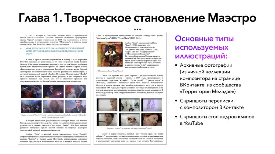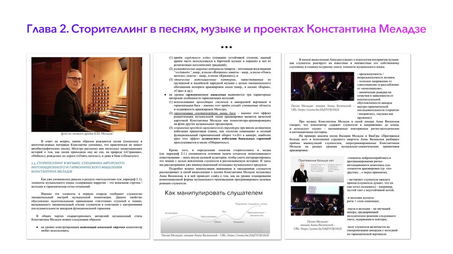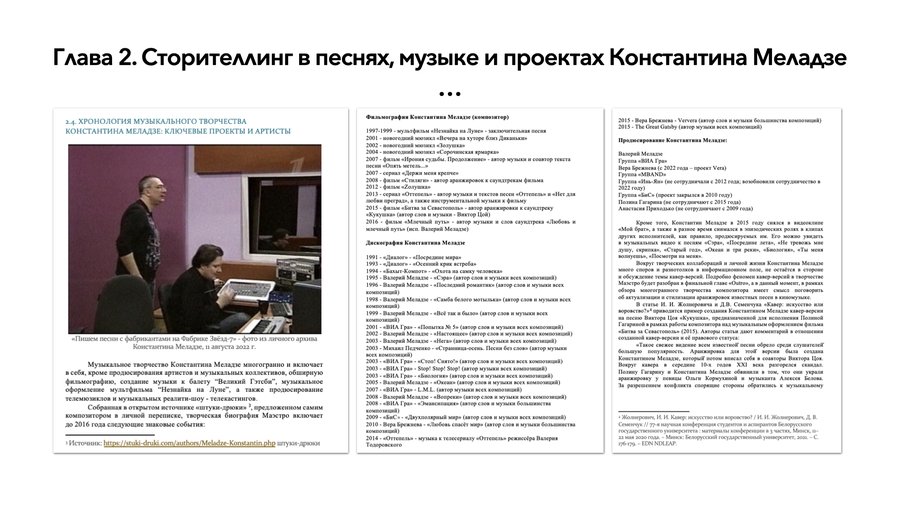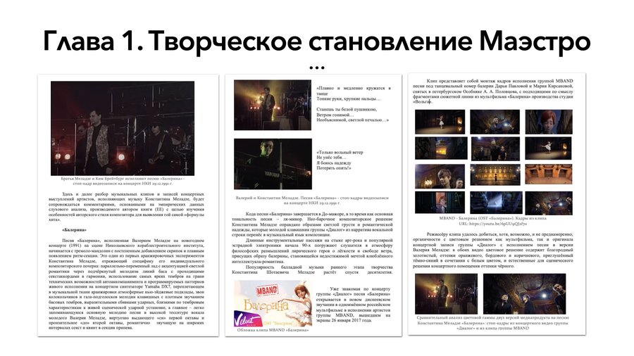 • время работы автора над книгой заняло около 2 лет; • книга состоит из трёх глав авторского текста, введения и заключения; • в книге представлены результаты системного нарративного и целостного слухового анализа песен, клипов и музыкального сопровождения к фильмам, киномюзиклам, мультипликационным фильмам и балету, в которых звучит музыка Константина Меладзе. Проанализирована дискография восьми основных артистических музыкальных проектов композитора.