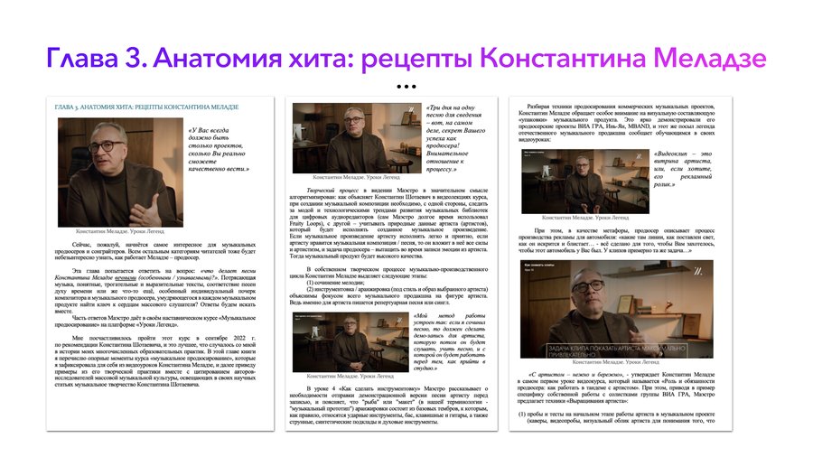 В третьей главе приводятся выводы исследования, основанные на критическом осмыслении курса видеолекций Константина Меладзе в курсе наставничества «Музыкальное продюсирование» онлайн-платформы «Уроки Легенд» и анализируются творческие коллаборации Маэстро с артистами проектов «Фабрика звёзд» и продюсерского центра Velvet Music. В качестве выводов предлагается «формула хита» — дайджест самых распространённых элементов авторского музыкального языка композитора, присутствующих в основных самых популярных песнях и композициях его музыкального наследия.
