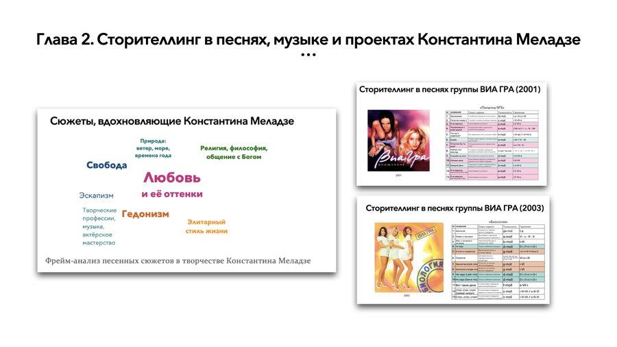 Результаты анализа сторителлинга в клипах артистов Константина Меладзе представлены в виде схем с пояснениями.