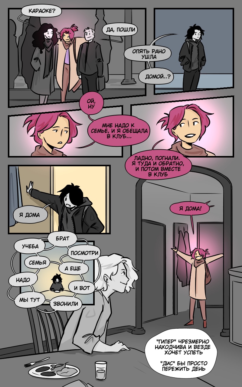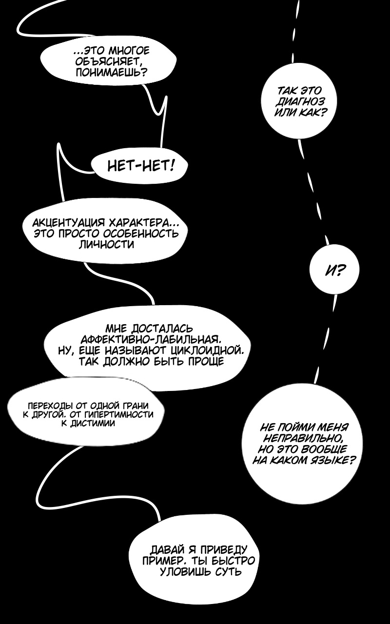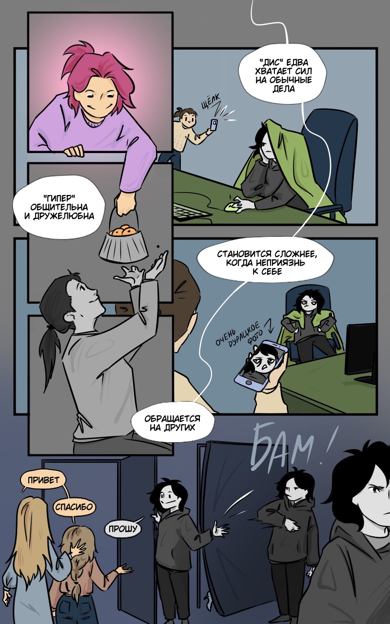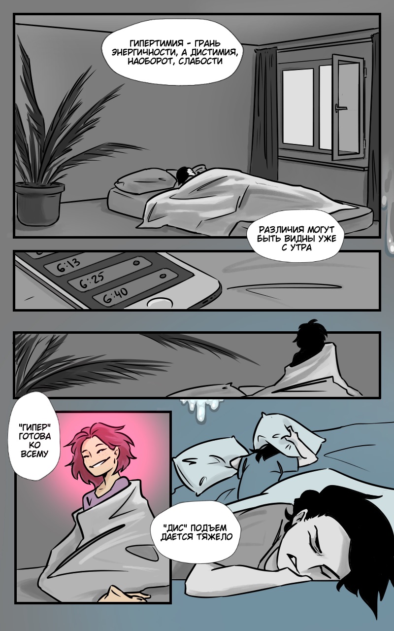 Суть проекта — нон фик, который рассказал и показал на примере одного и того же дня различия между гепертимной и дистимической гранями циклоидной акцентуации характера