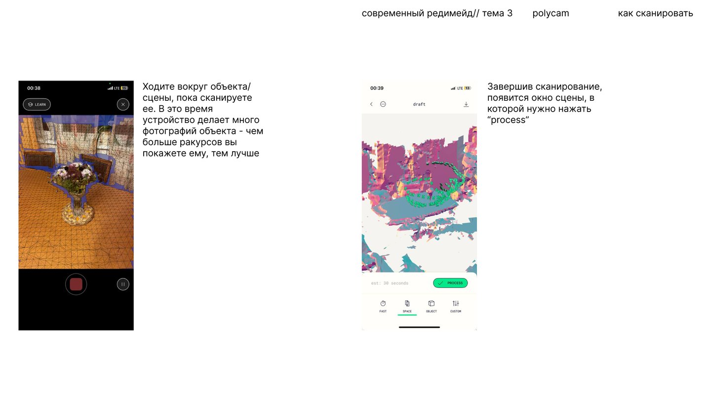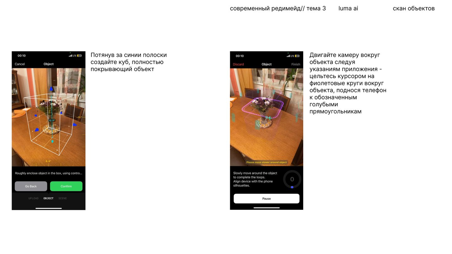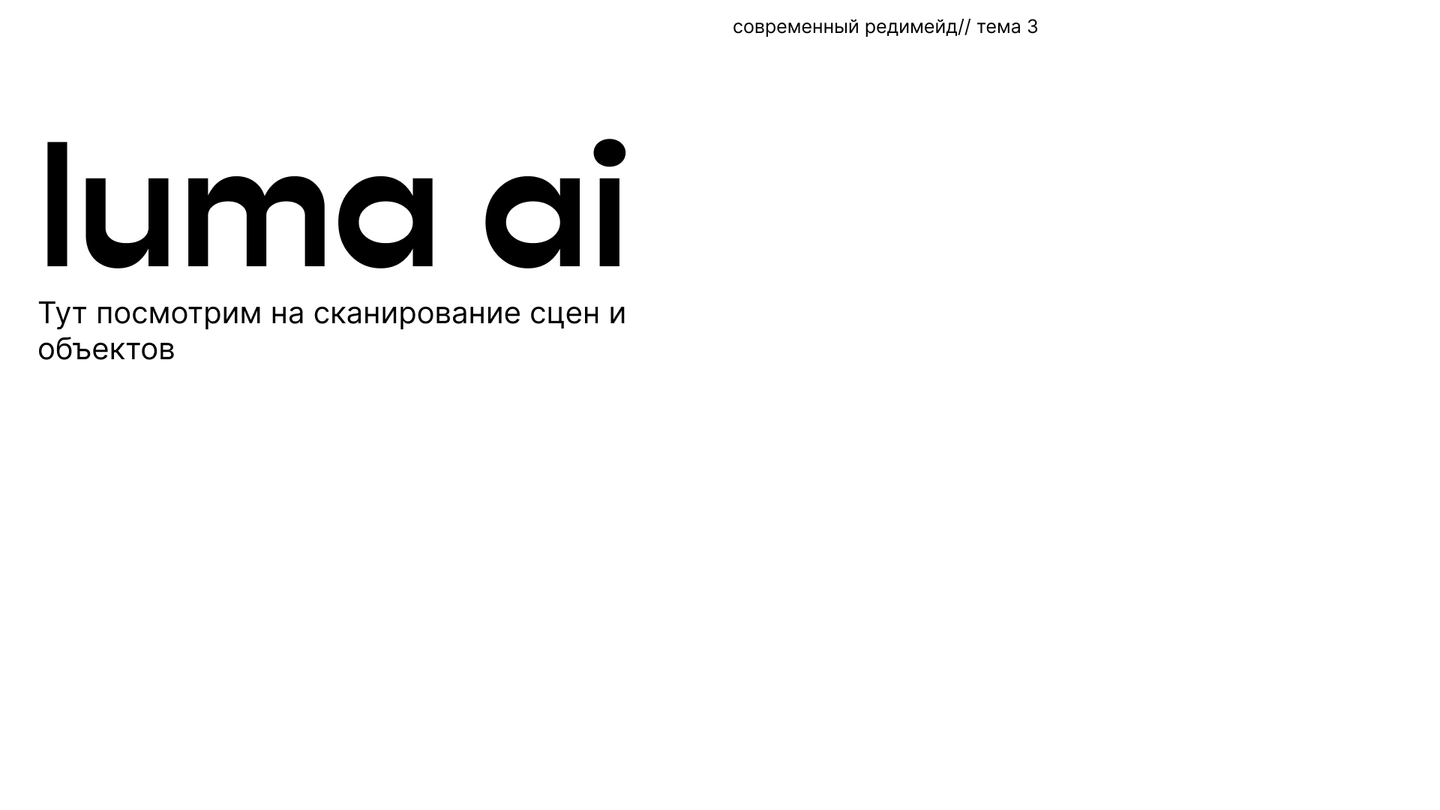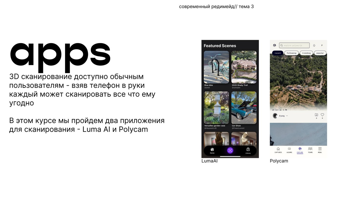 В течении темы студенты получат базовые знания по 3D сканированию, а также освоят инструментарии Polycam и LumaAI