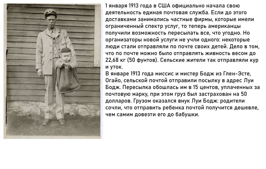 Создание авторского изделия на основе новости об американской почте 1900-х годов. Baby mail — проект о глупости людей и их желании сэкономить, даже если дело касается собственных детей. В январе 1913 года среди жителей Америки начала популяризоваться отправка своих детей по почте, ведь это было дешевле, чем довозить до нужной точки самостоятельно. Из-за цели потратить как можно меньше денег люди отдавали своих детей почтальонам, отправляли их в багажных вагонах поездов, ставя экономию выше безопасности.