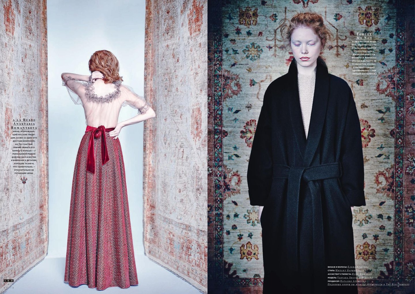 Стилист: Михаил Барышников Ассистент стилиста: Илья Фомичев Визажист и мастер по волосам: Елена Крыгина Модель: Варвара Шутова Продюсер: Наталья Архипова