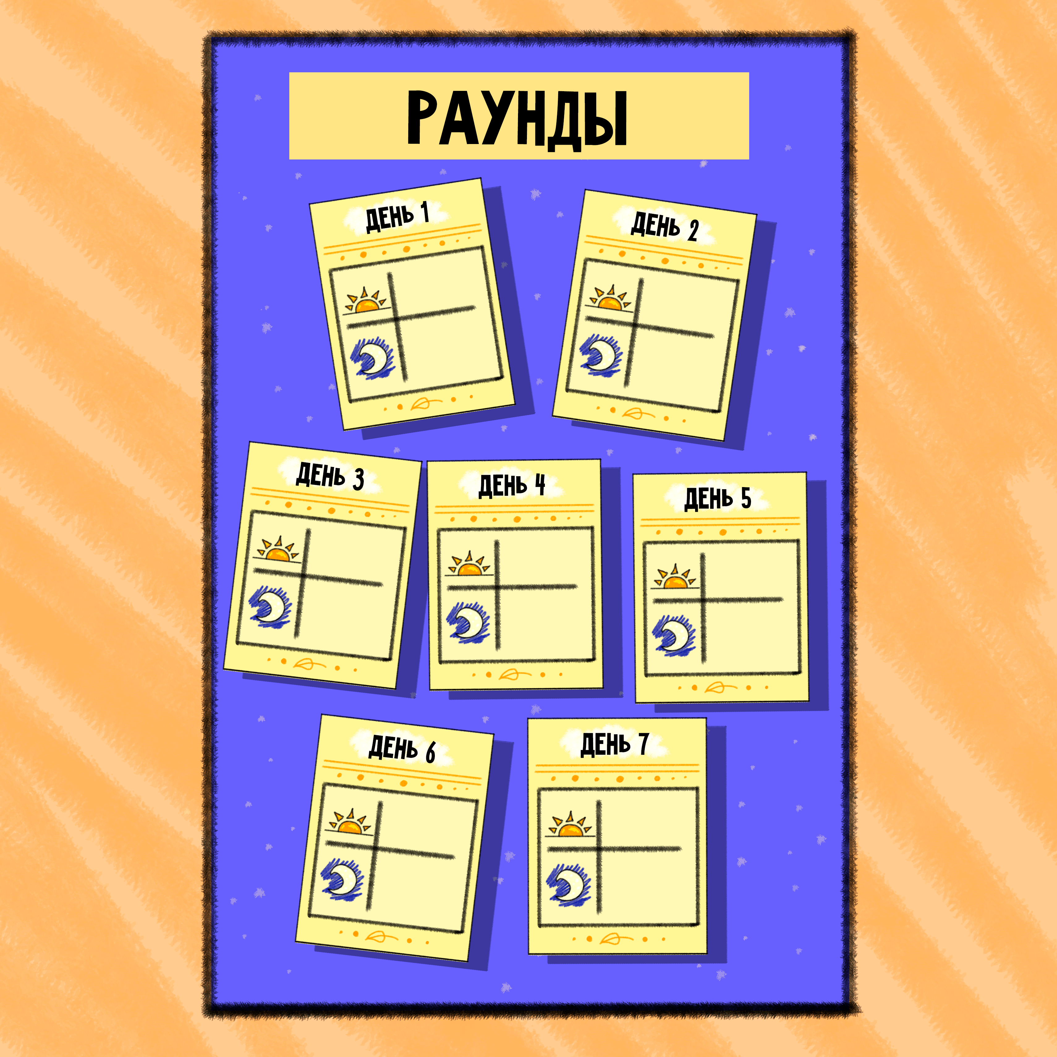 Всего 7 раундов (= 7 дней). За раунд опоссум может сделать по 2 хода днем и ночью (то есть минимум 4 хода на каждого игрока)