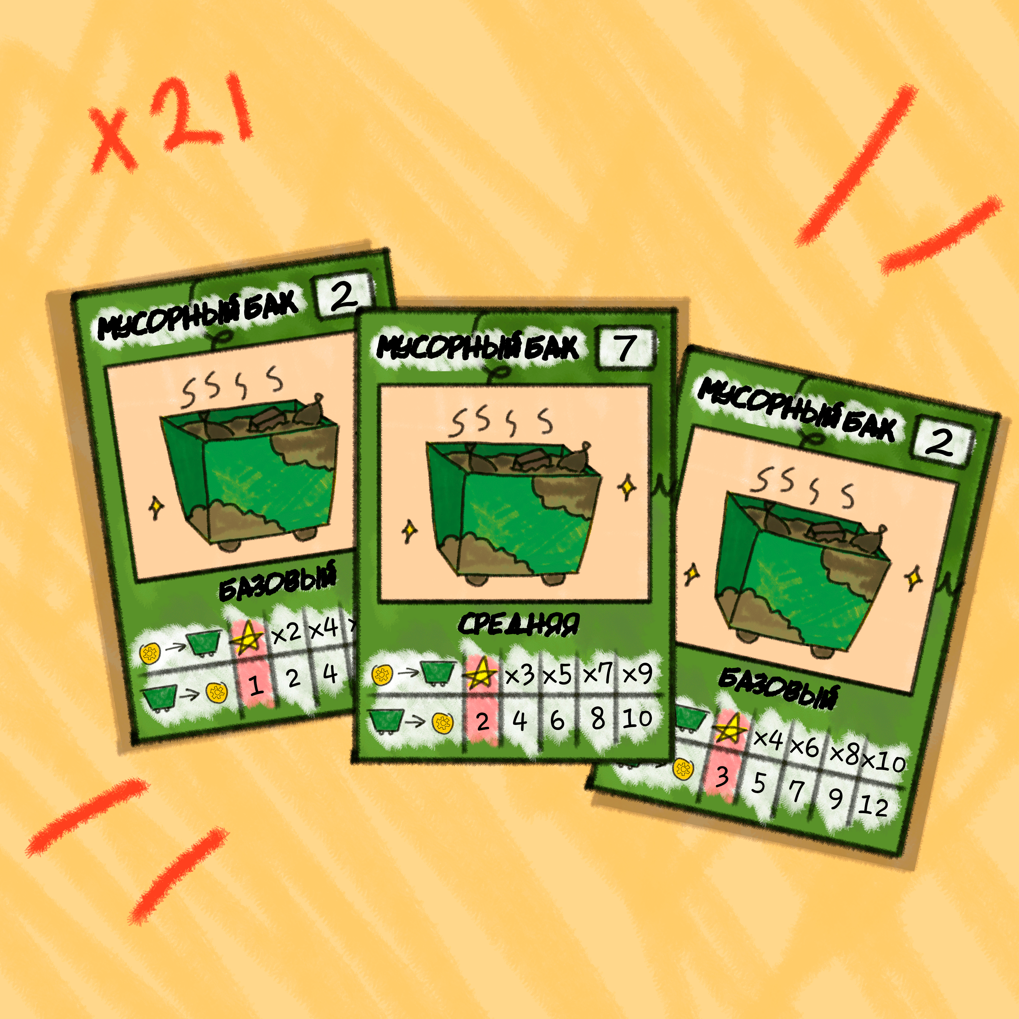 — У каждой помойки есть своя карта. Игрок берет карточку из колоды или забирает ее у другого игрока (все улучшения передаются с помойкой), если захватил мусорку. На карте отмечено количество ресурсов, которые она будет давать, если в нее вложить то или иное количество «Полезного мусора». В таком случае помойка будет давать больше мусора в следующих раундах (столбики 2, 3 и 4). Если помойку не прокачивать, то она будет давать стартовые значения (1 столбик, отмеченный розовым)