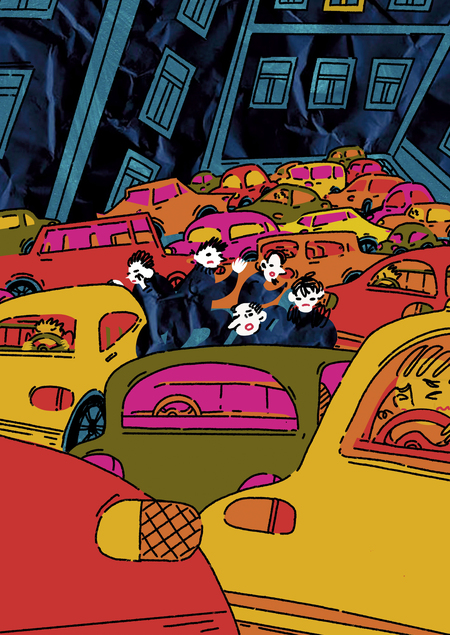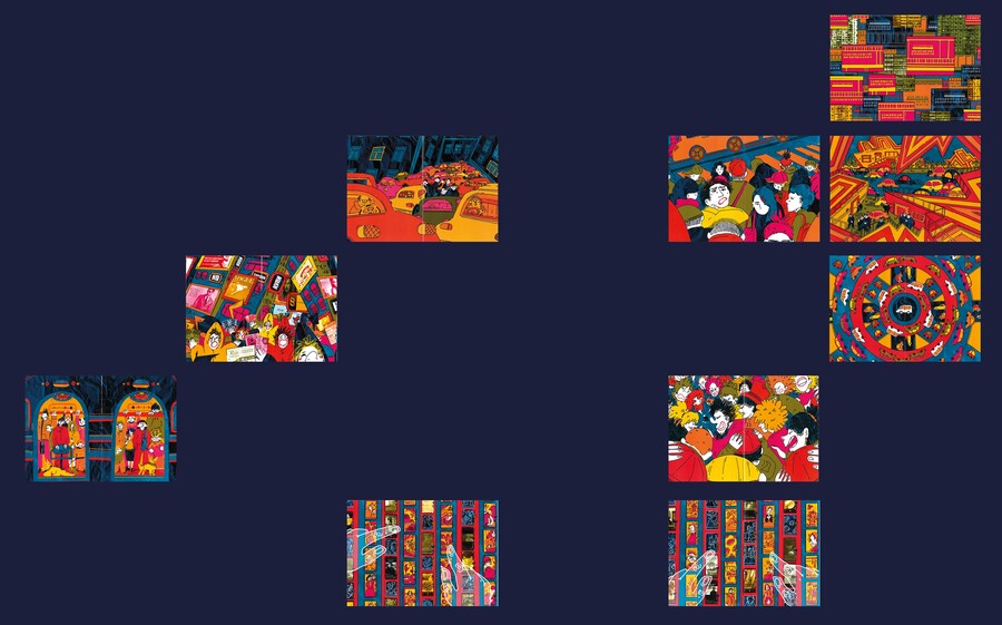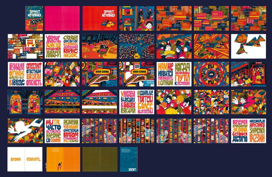 Темп жизни в мегаполисах продолжает расти, а вместе с ним и нагрузка на психику его жителей. Мой артбук является собирательным образом этого явления и создаёт атмосферу перегрузки с помощью выбранных цветов, количества деталей и текстур.