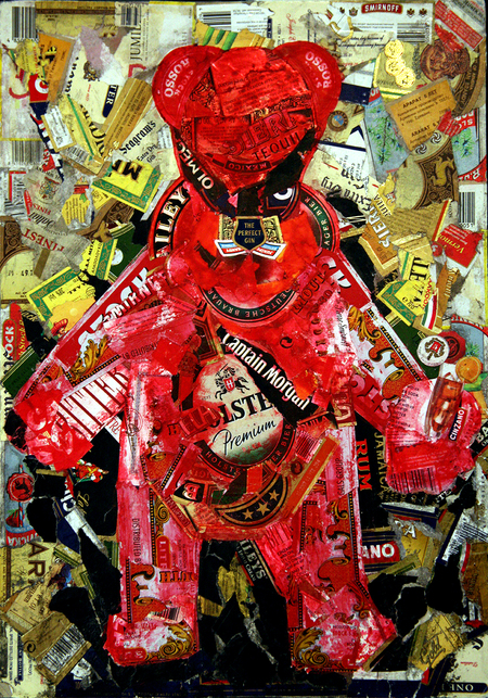 Коллаж на картоне из этикеток. Тушь. 2005 год 35×50 см