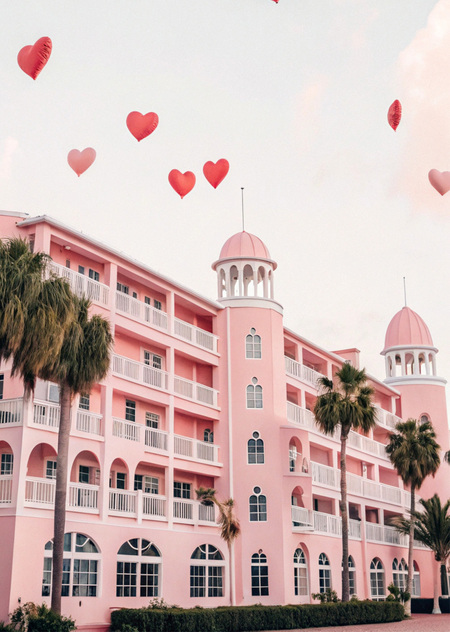 Промпт: Wonderful hotel is full of love and pink. Hearts are everywhere.