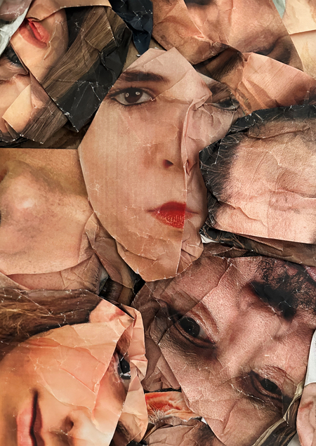 Скульптура представляет собой диаграмму, столбцы которой состоят из скомканных листов бумаги, на которых напечатаны лица людей.
