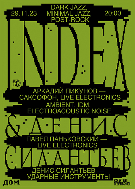 The poster for the INDEX & Denis Silentiev concert at the Dom Cultural Centre. It’s a collaboration of one of the brightest modern drummers and a duet of experimental electroacoustic music.