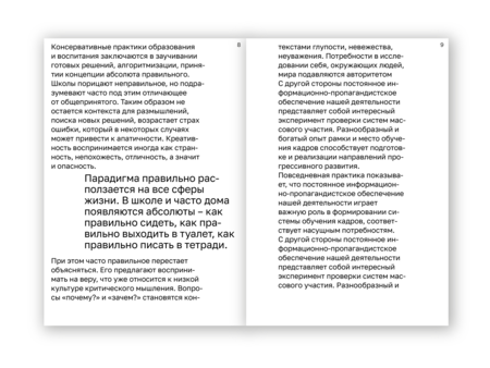 Принцип чтения: Оформление издания предлагает 2 способа чтения — краткий и полный. Тексты в книге даны двумя видами кегля — крупно и более мелко. Крупные тексты позволяют быстро прочитать всю книгу. Мелкие — погрузиться во все содержание. Для быстрого прочтения нужно читать только крупный кегль, для полноценного — и крупный и мелкий последовательно.