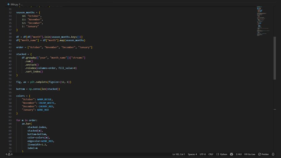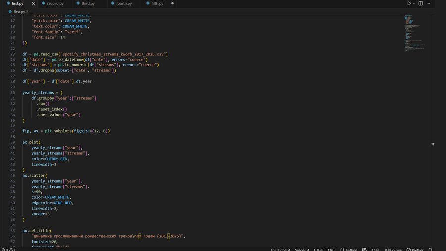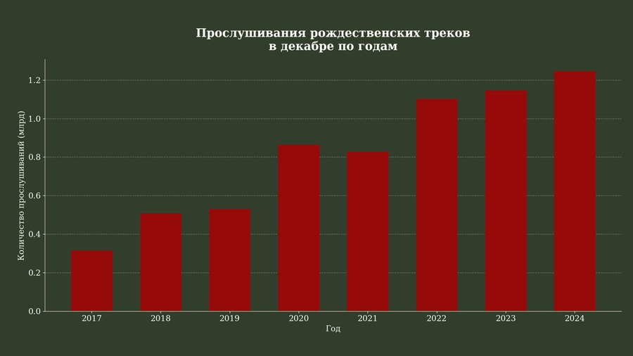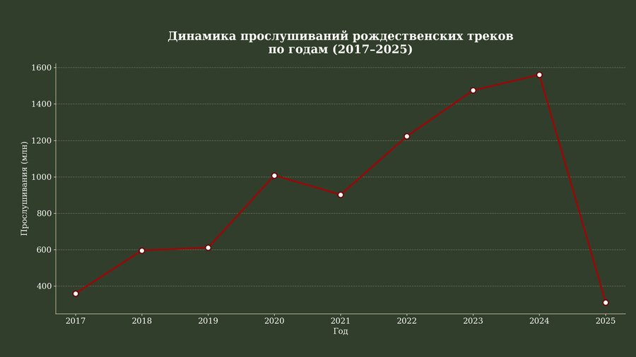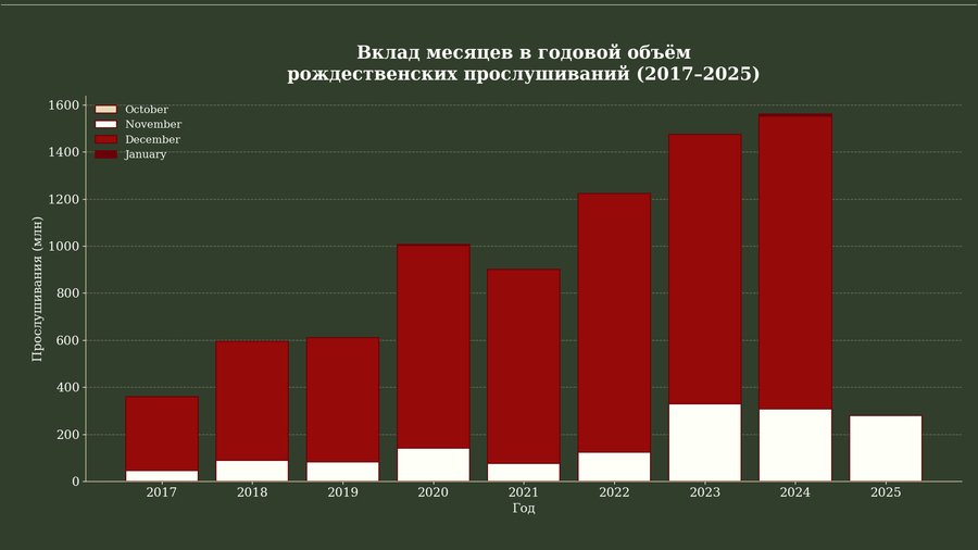 Анализ прослушиваний рождественской музыки на Spotify с 2017 по 2025 год показывает чёткую сезонность. Каждый год к концу месяца интерес к такой музыке растёт, достигая пика перед и сразу после Рождества. Пользователи слушают эти треки в основном во время праздников.