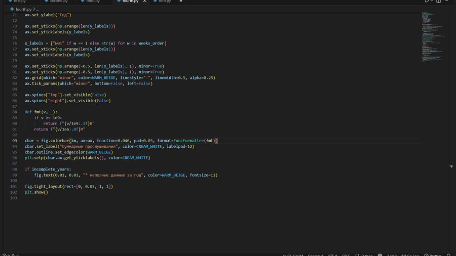 Тепловая карта показывает, в какие недели года прослушивания растут сильнее всего. Она хорошо отражает сезонность: пик сосредоточен в конце года, а интенсивность этого пика отличается в разные годы.